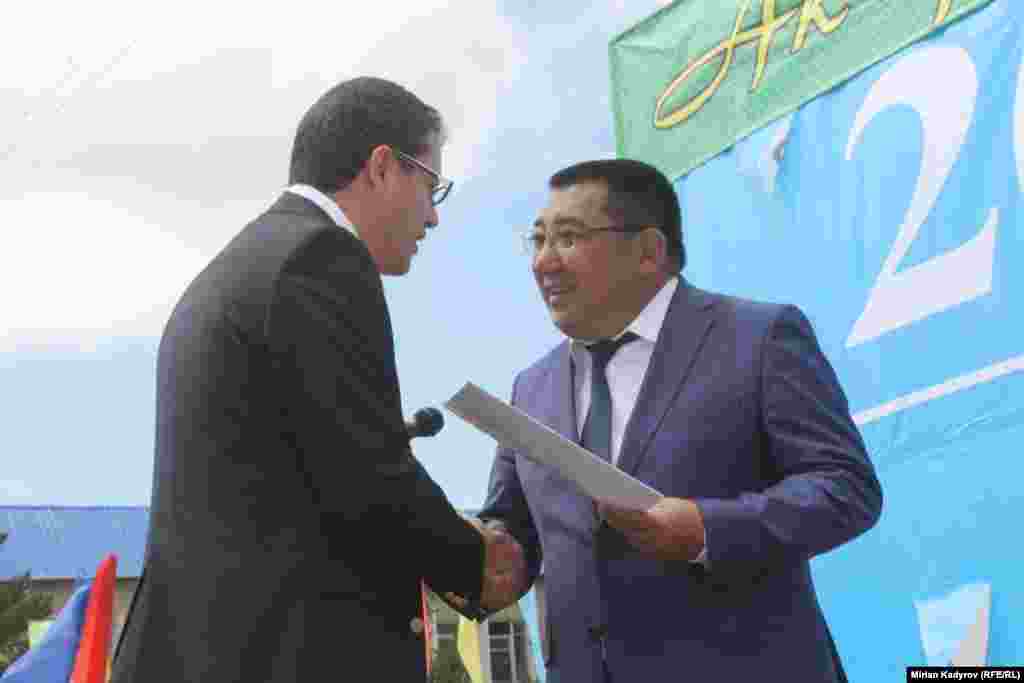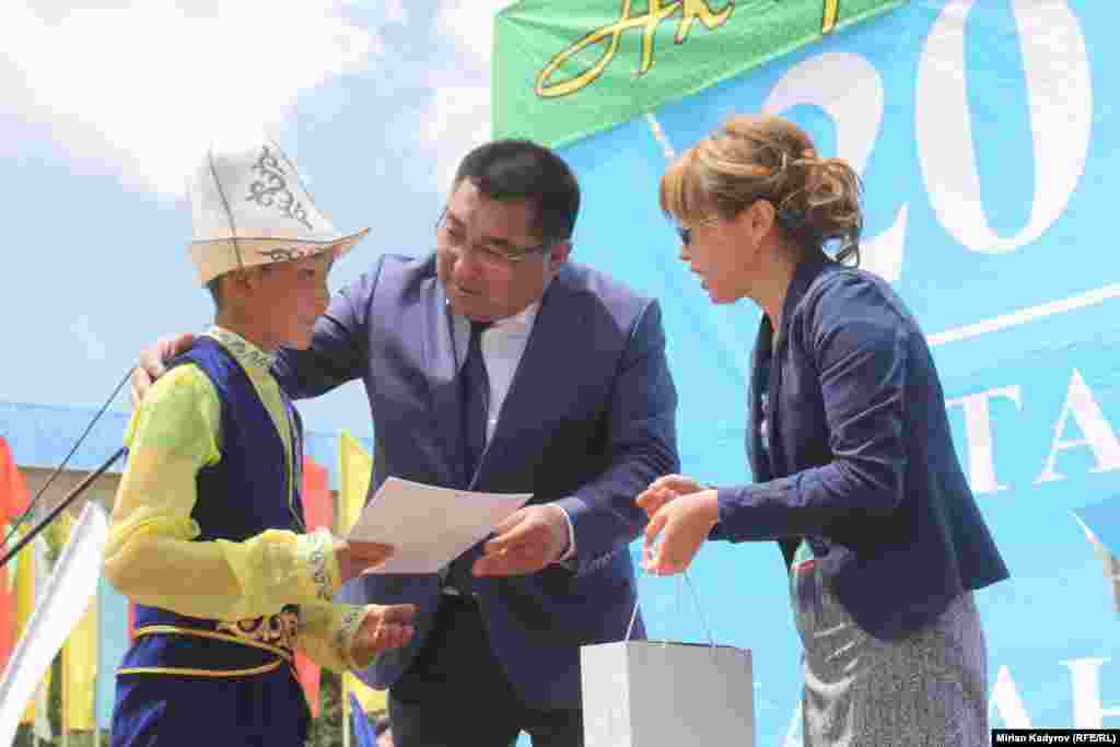 Катышуучуларга өкмөттүн Нарын облусундагы ыйгарым укуктуу өкүлү Аманбай Кайыпов ыраазычылык каттарды жана белектерди тапшырып, куттуктады.