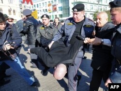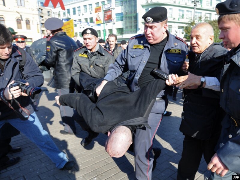 Россия. Полиция нааразылык акциясынын катышуучусун кармап кетүүдө. Москва. 16-октябрь 2009